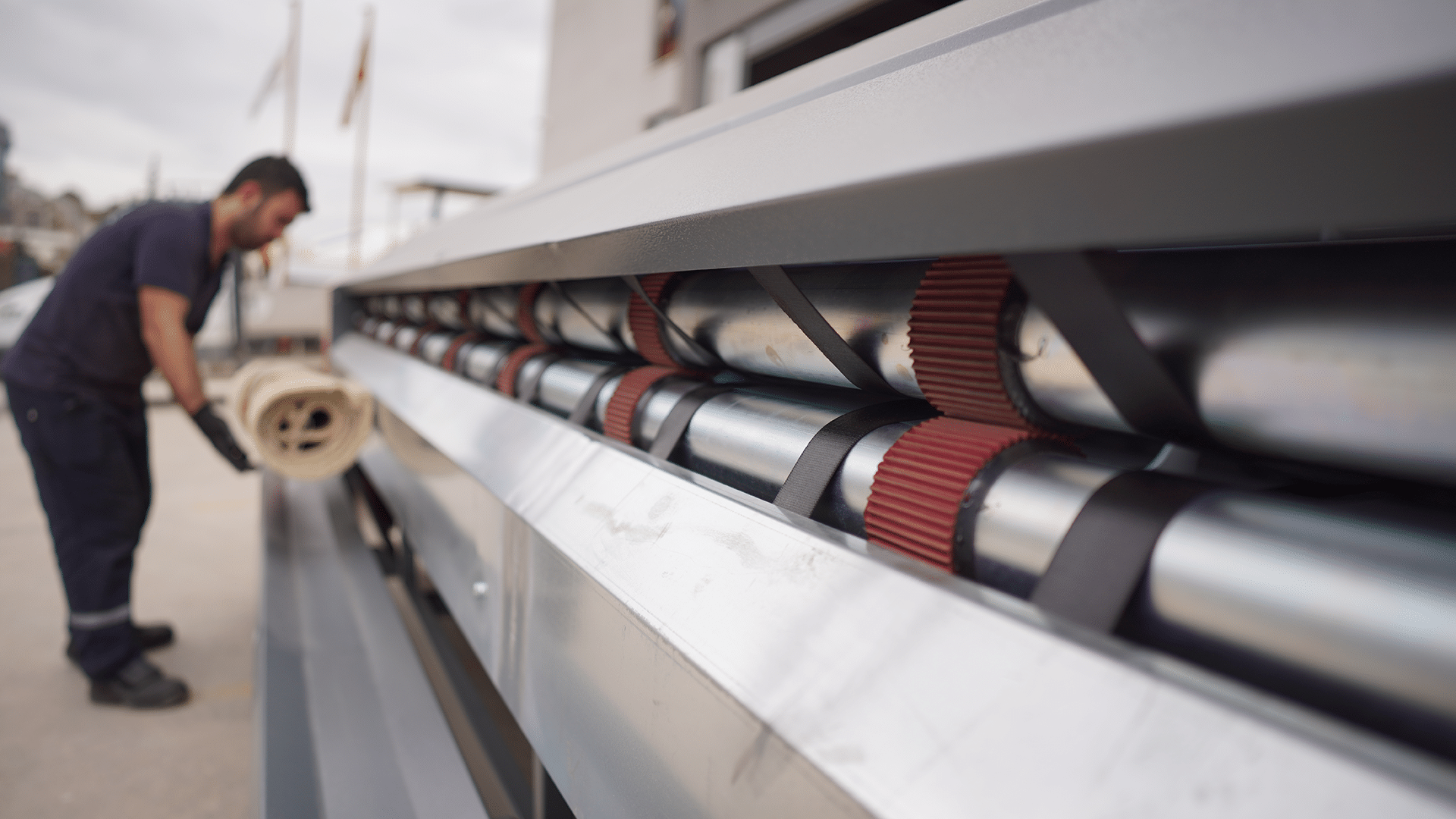 GIGA Series Fully Automatic Carpet Washing Machines are high-capacity, PLC-controlled conveyor-type washing systems developed for professional carpet cleaning plants. With belt widths from 250 to 420 cm, 8–18 disc brush configurations, upper–lower roller brush system, water-saving flat spray nozzle technology and advanced vacuum/roll-winding modules, they deliver maximum hygiene with minimum water and chemical consumption.